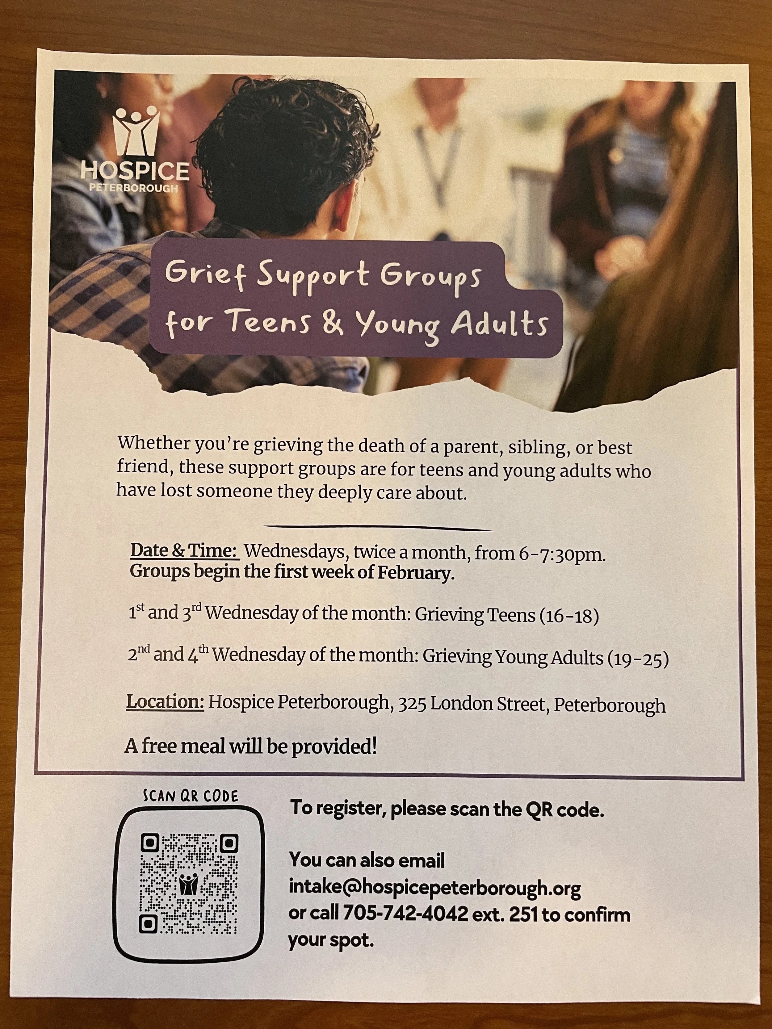 Support group for grieving teenagers ages 16-18: whether grieving the death of a parent, sibling, or best friend, these support groups are for older teens who have lost someone they deeply care about. 1st and 3rd Wednesday of the month from 6-7:30pm. Drop-In starting February 2026. In person at Hospice Peterborough. These groups are free and a free meal will be provided. Please see information below to register.
